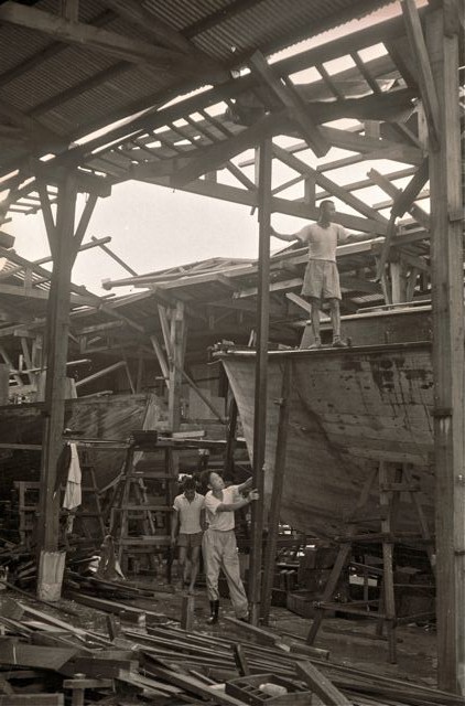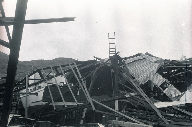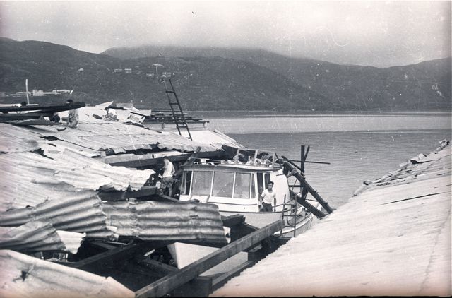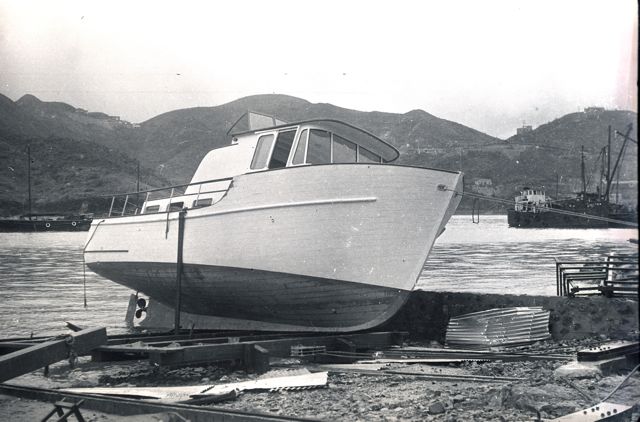 These Chanteyman boats were under construction when Typhoon Wanda struck the Anmerican Marine Hong Kong yard on September 1st 1962. The photos show two boats on the slipway and at least one more under what remains of the sheds. The photos would have been taken within a couple of days of the typhoon. These photographs were taken in early September 1962 so we know that the boat with the name on it would have been imported into Southern California through the ports at Long Beach or LA probably sometime in October 1962. The other two boats that appear in the pictures will have adjacent hull numbers. Caption by Tony Fleming The boat with the name is Mei Yen identified as Hull #12 on the list of hull numbers and initial owners on the website. Since the yard did not use the #13 on hulls (Chinese superstitions!) the other boats shown may be Hulls # 11 & 14.